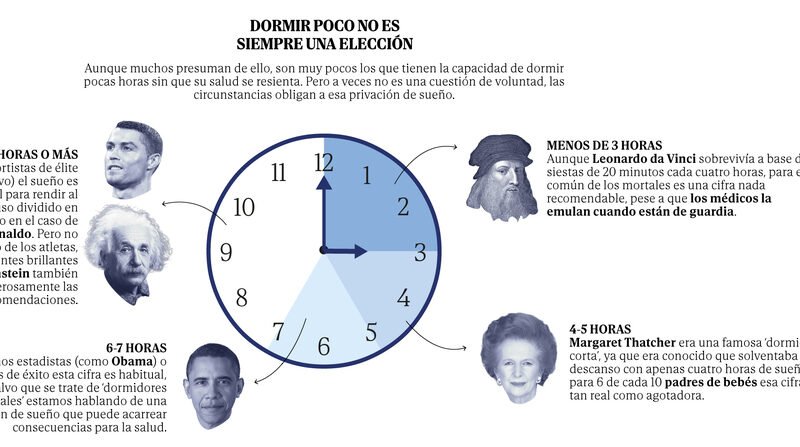 Pero toda regla tiene una excepción, y en ésta la constituyen los llamados ‘dormidores cortos’. «No es un mito», explica el doctor Barrecheguren, «hay un pequeño porcentaje de adultos cuyas necesidades de sueño son muy inferiores a la media». Hablamos de unas cinco o seis horas diarias de sueño, incluso cuatro en casos extraordinarios, mientras que la recomendación (para adultos) es de unas siete u ocho horas.