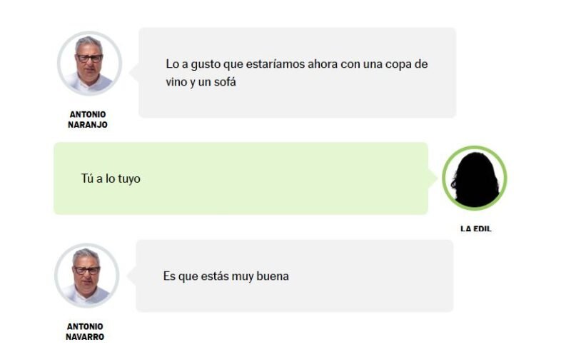 Los documentos que acompañan la denuncia recogen algunos de ellos en los que la denunciante se muestra tajante, trata de cambiar de conversación y orientarla al ámbito profesional, pero él insiste: “¿Qué puedo hacer para reconquistarte?“, ”Dime», “No me haces caso”, le repetía Navarro cuando ella trataba de hablar de un problema municipal. Y cuando le preguntaba por una agresión homófoba, él respondía: “Cambio de tercio. Yo mañana solo te diré una cosa. Y será al oído. Buenas noches”. Otros del estilo: “Cuando te enfadas te pones muy guapa”, “bonita foto de perfil”, “iré depilado por si tienes un desliz”. Además de otras decenas de peticiones de llamadas más tarde de las 22 horas, diciendo “me encuentro fatal”, “te quiero”, cuando ella le respondía molesta y con evasivas.