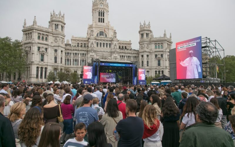Numerosas familias, estudiantes y grupos de monjas llegadas de toda España se congregan frente al Palacio de Cibeles. Pueden verse abrazos y besos, afectos que van y vienen como manifestaciones de un amor fraternal. “Los jóvenes españoles estamos en búsqueda de algo más”, sostiene Marcos Liria, de 22 años y pasante de abogado. “Eso que nos falta solo podemos encontrarlo en el Señor”, defiende. El Ayuntamiento reserva desde hace años esta plaza cargada de simbolismo a las celebraciones del Real Madrid, los fastos del 12 de octubre y la Fiesta de la Resurrección. Aquí también tendrá lugar en junio el encuentro y la vigilia con el papa León XIV, como desvela en primicia el obispo de Madrid, José Cobo, al dar la bienvenida al público. “Gracias por que un año más podamos alegrarnos de la resurrección con nuestros vecinos”. El maestro de ceremonias, Dj Pulpo, pide a los asistentes que levanten las manos al cielo.