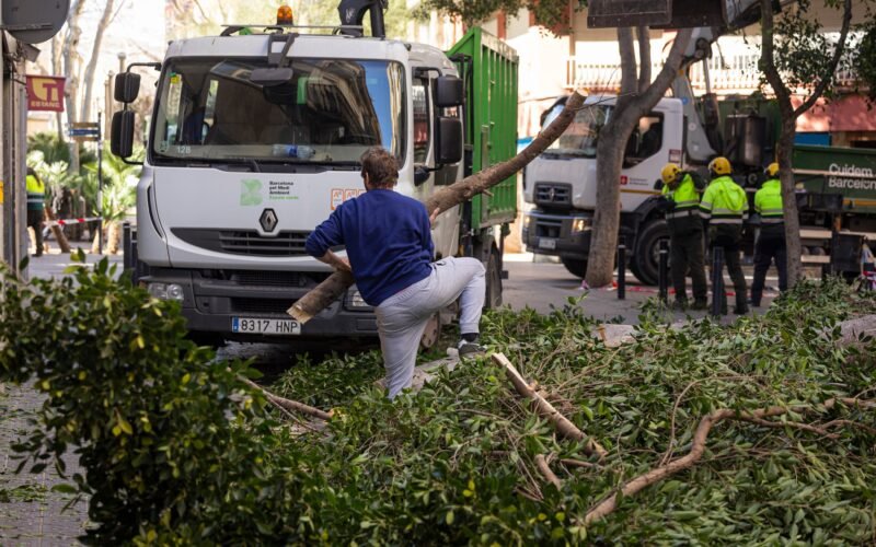 Operarios recogen restos de árboles caídos durante el temporal en Barcelona del jueves.GIANLUCA BATTISTA