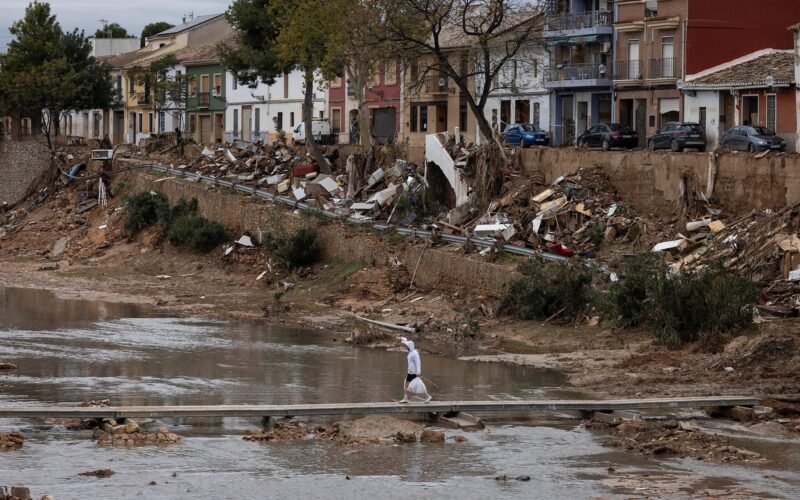 Un vecino cruza la Rambla del Poyo con un puente peatonal en Picanya (Valencia), en una imagen del 13 de noviembre de 2024.